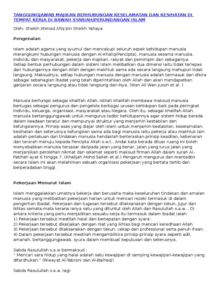 Tanggungjawab Majikan Berhubungan Keselamatan Dan Kesihatan Di Tempat Kerja Di Bawah Syariah Pdf