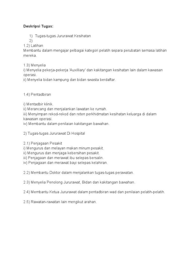 Kesihatan dalam pengurusan harian di klinik kesihatan dan penyeliaan di samping menjalankan tugas-tugas Jururawat Masyarakat Gred U19 dari. Senarai Tugas Jururawat dan Kerjaya Jururawat Berikut dikongsikan adalah maklumat tentang kerjaya jururawat yang berkaitan dengan gaji jururawat tugas.