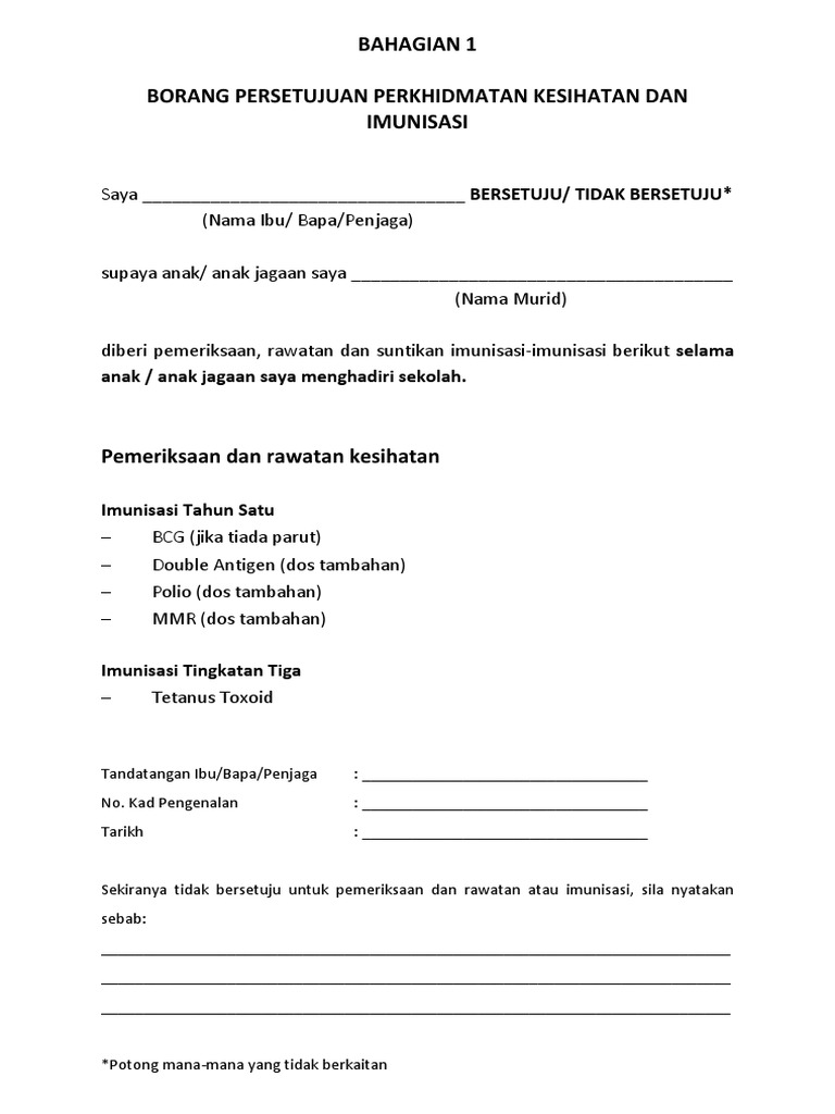 Surat persetujuan kesihatan tahun 1. Borang Persetujuan Perkhidmatan Kesihatan Dan Imunisasi Tahun 1. BORANG PERSETUJUAN PERKHIDMATAN KESIHATAN SEKOLAH UNTUK MURID-MURID SEKOLAH Saya BERSETUJU supaya nama penuh ibubapapenjaga anak. Jagaan sayadi beri nama murid rawatan dan imunisasi berikut selama dia menghadiri sekolah.